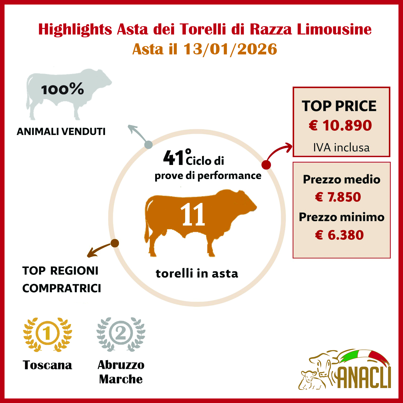 Un’asta destinata a rimanere negli annali di Anacli (Associazione nazionale allevatori delle razze bovine Charolaise e Limousine Italiane). Il 13 gennaio scorso, presso il Centro Genetico di San Martino in Colle (Pg), la vendita dei torelli del 41° Ciclo di Prove di Performance della razza Limousine Italiana ha fatto registrare risultati mai raggiunti prima, confermando in modo inequivocabile il valore del percorso di selezione portato avanti dall’Associazione.