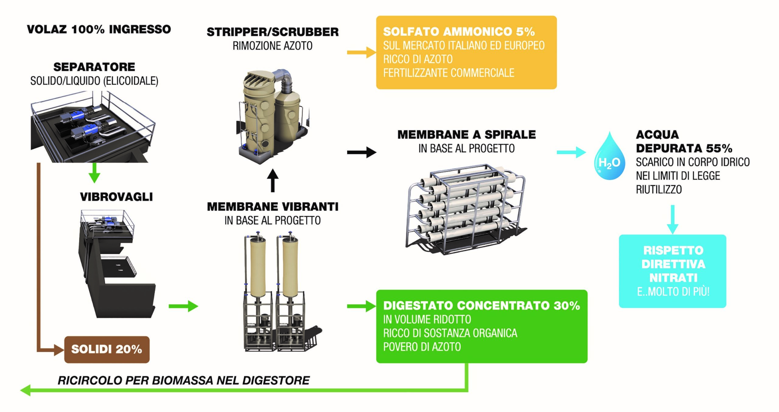 Il sistema riduce il carico di azoto ammoniacale del liquame e del digestato, rende disponibile il solfato ammonico utilizzabile come concime (e riconosciuto come fertilizzante Renure) e produce acqua purificata scaricabile in corpo idrico superficiale.