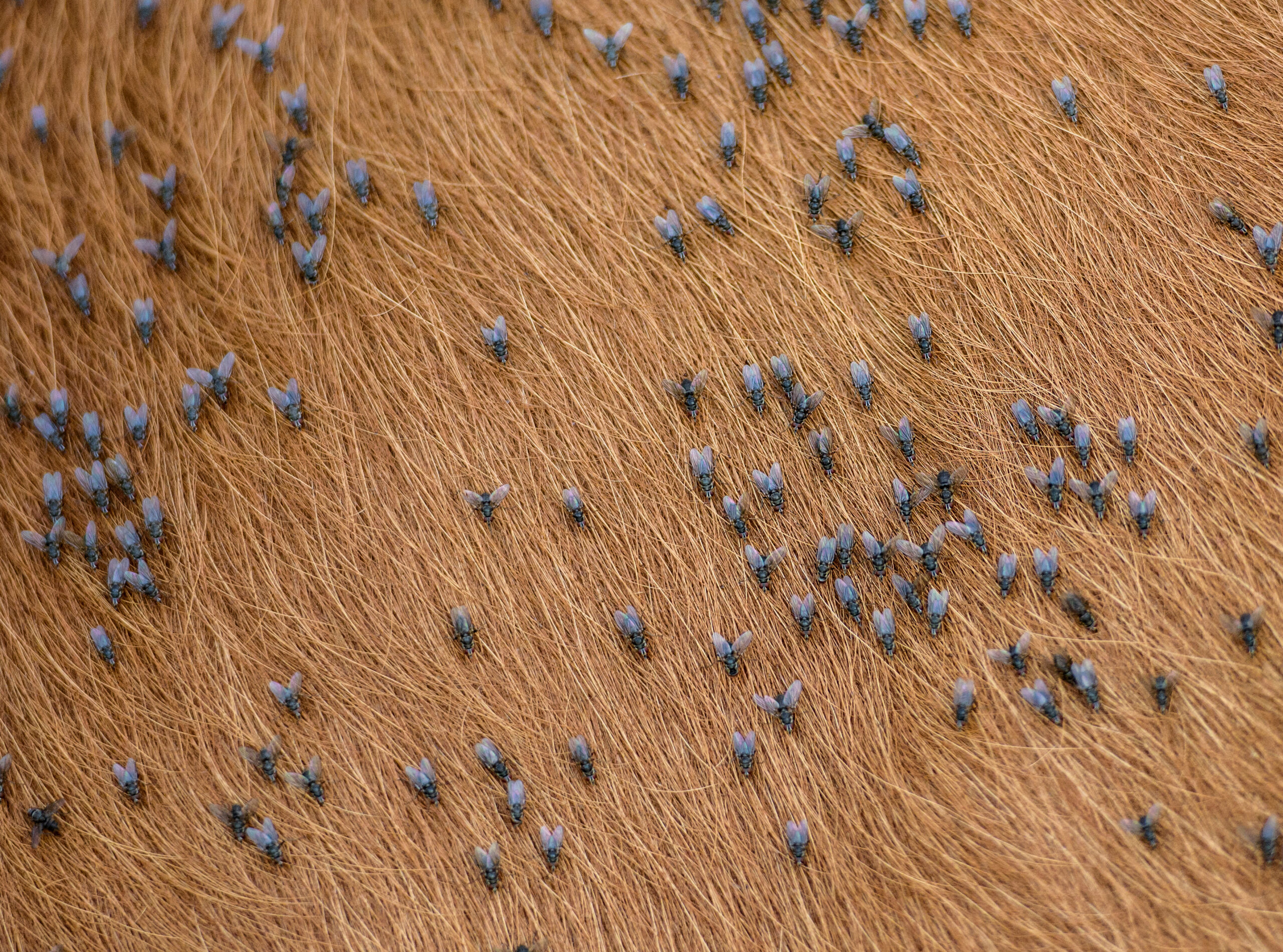 Haematobia irritans, o mosca del corno, è l’altra mosca che si nutre del sangue degli animali. Il suo nome comune deriva dall’abitudine di queste mosche di rag­grupparsi attorno alla base delle corna durante le ore calde.