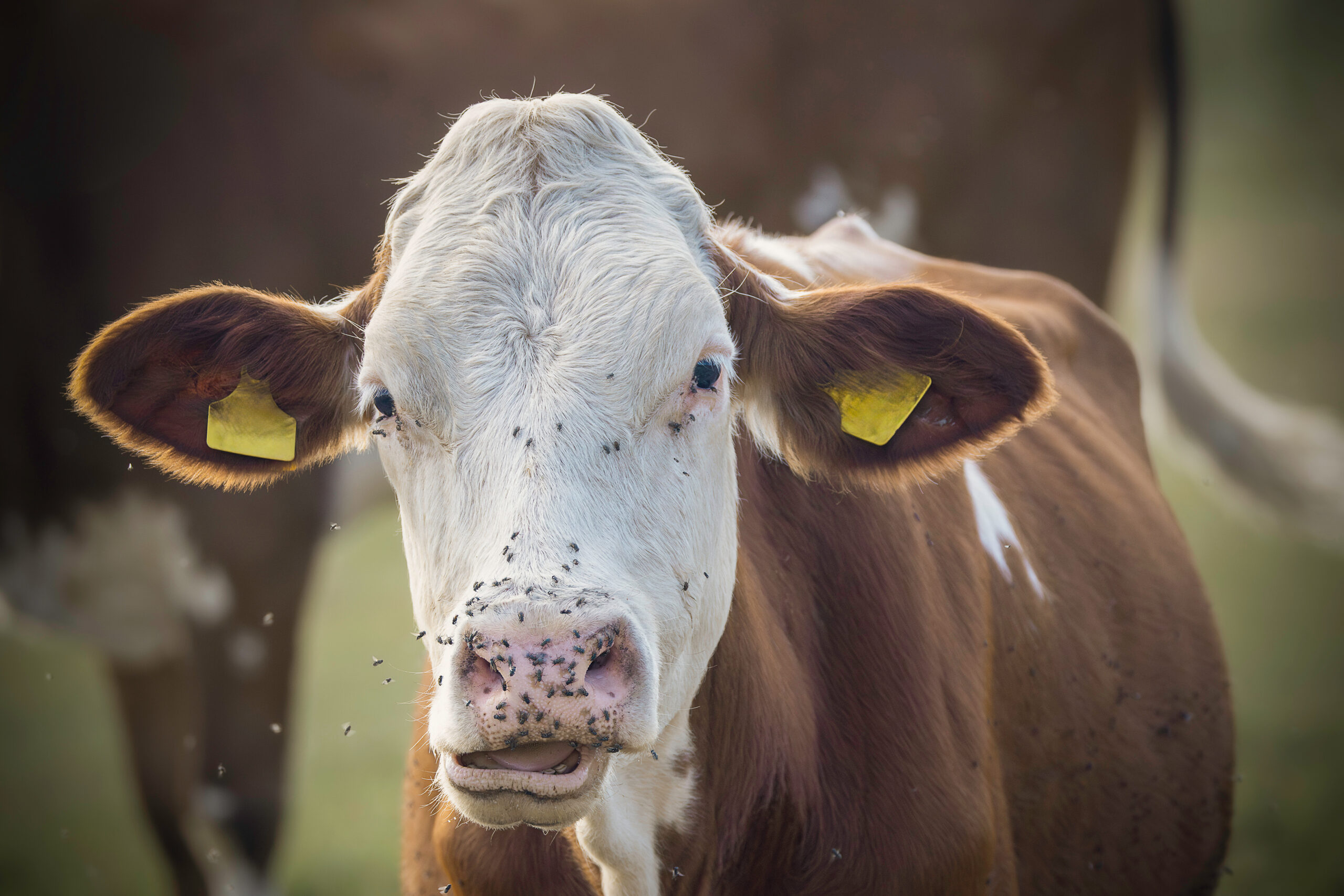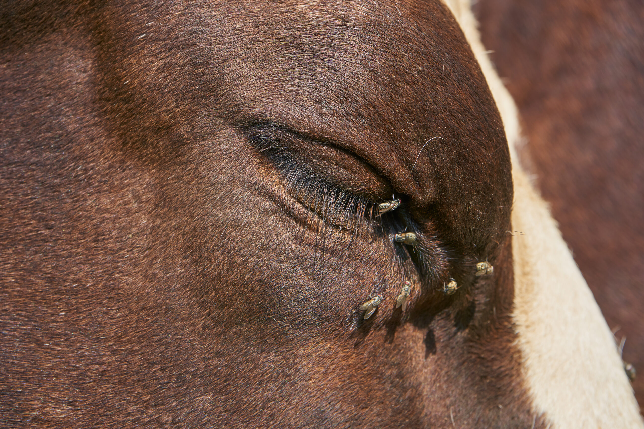 Mosche sul muso di un bovino. La gestione di questi insetti è molto importante per il benessere, la produttività e l'igiene dell'allevamento.