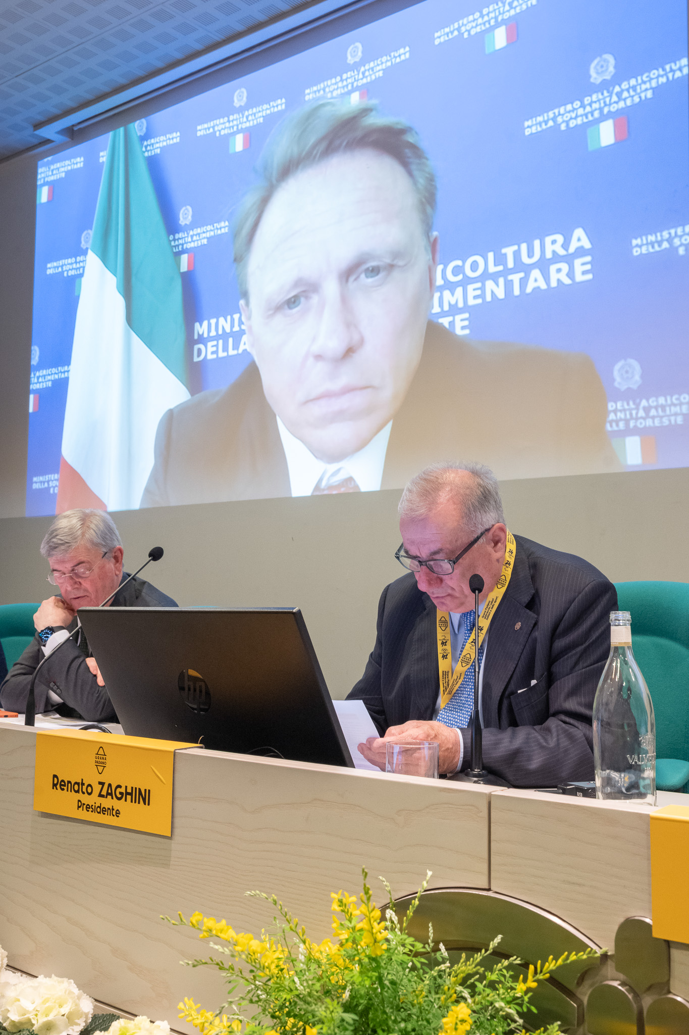 Il ministro dell’Agricoltura, Francesco Lollobrigida, in videochiamata all’assemblea del Consorzio. Da sinistra il direttore generale e il presidente del Consorzio, Stefano Berni e Renato Zaghini