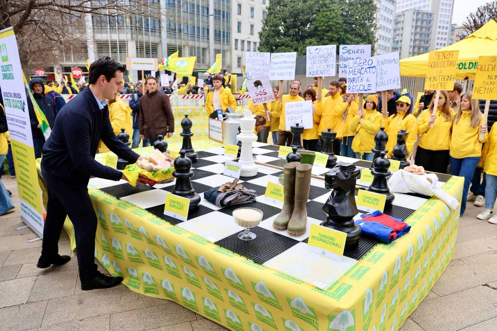 Ai tanti problemi irrisolti che le imprese agricole si trovano ad affrontare è stato dedicato il flash mob dei giovani di Coldiretti Lombardia, che sulla scacchiera gigante - allestita in piazza con le minacce all’agricoltura - hanno depositato simbolicamente i prodotti di campi e stalle, insieme agli attrezzi del lavoro in cascina, ormai quotidianamente a rischio di sopravvivenza.