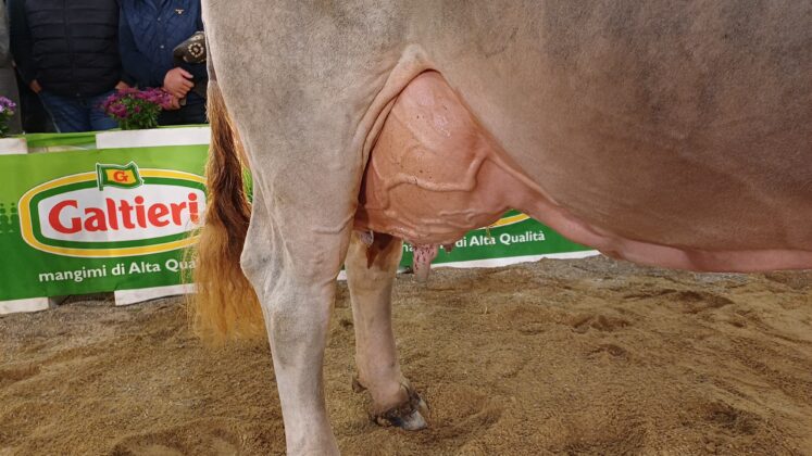 «È una vacca eccellente per equilibrio generale e soprattutto per apertura del costato e posteriore alto e largo. L’apparato mammario si qualifica molto bene soprattutto nella solidità dell’attacco anteriore».