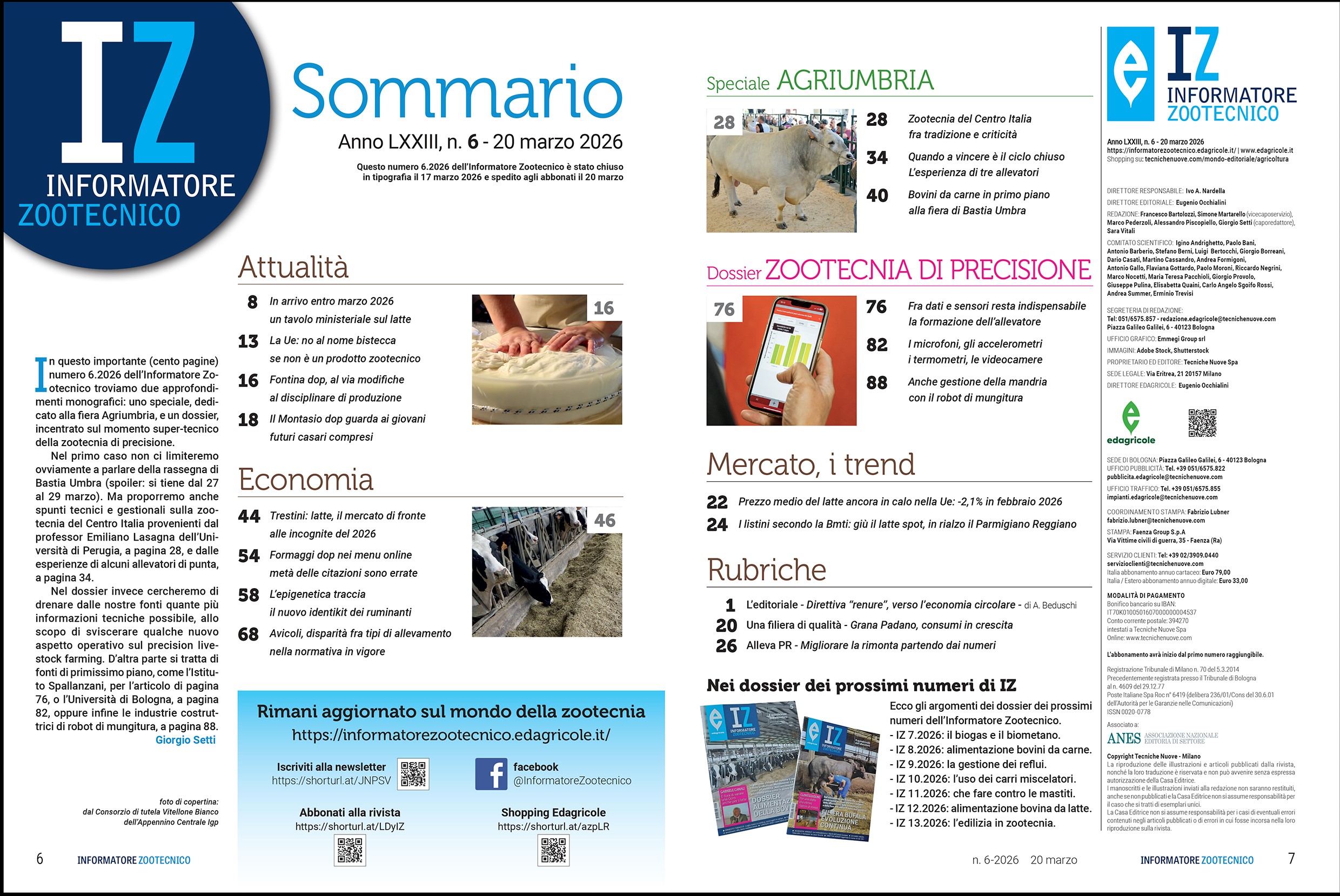 In questo importante (cento pagine) numero 6.2026 dell’Informatore Zootecnico troviamo due approfondimenti monografici: uno speciale, dedicato alla fiera Agriumbria, e un dossier, incentrato sul momento super-tecnico della zootecnia di precisione.