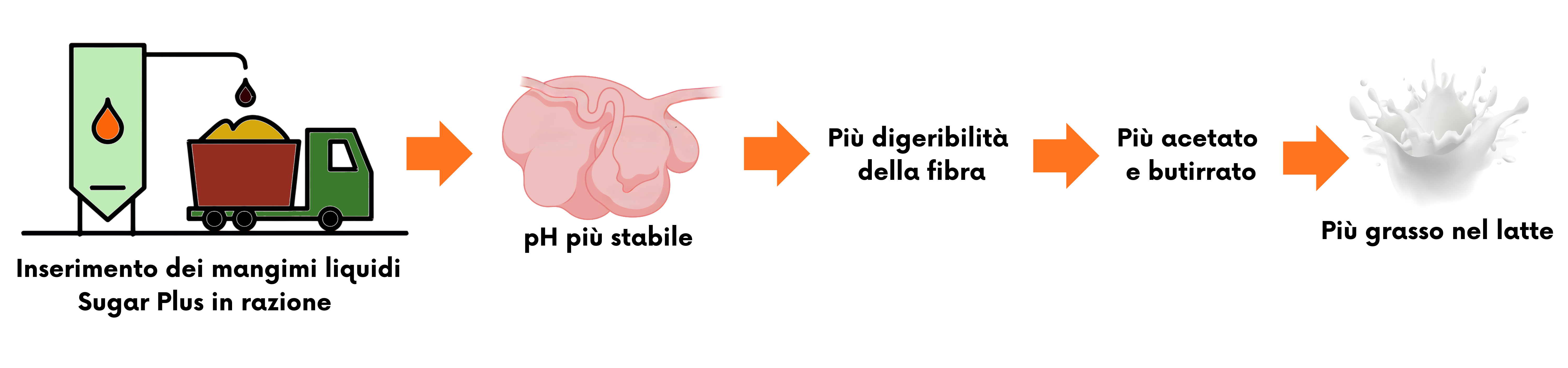 Questi effetti, combinati, si traducono in più latte, più grasso, più proteina e migliore efficienza alimentare. Grazie alla capacità di modulare il ritmo fermentativo, i mangimi liquidi Sugar Plus rappresentano uno strumento nutrizionale semplice ed efficace per aumentare produzione, qualità e valore del latte, migliorando al tempo stesso efficienza e sostenibilità.